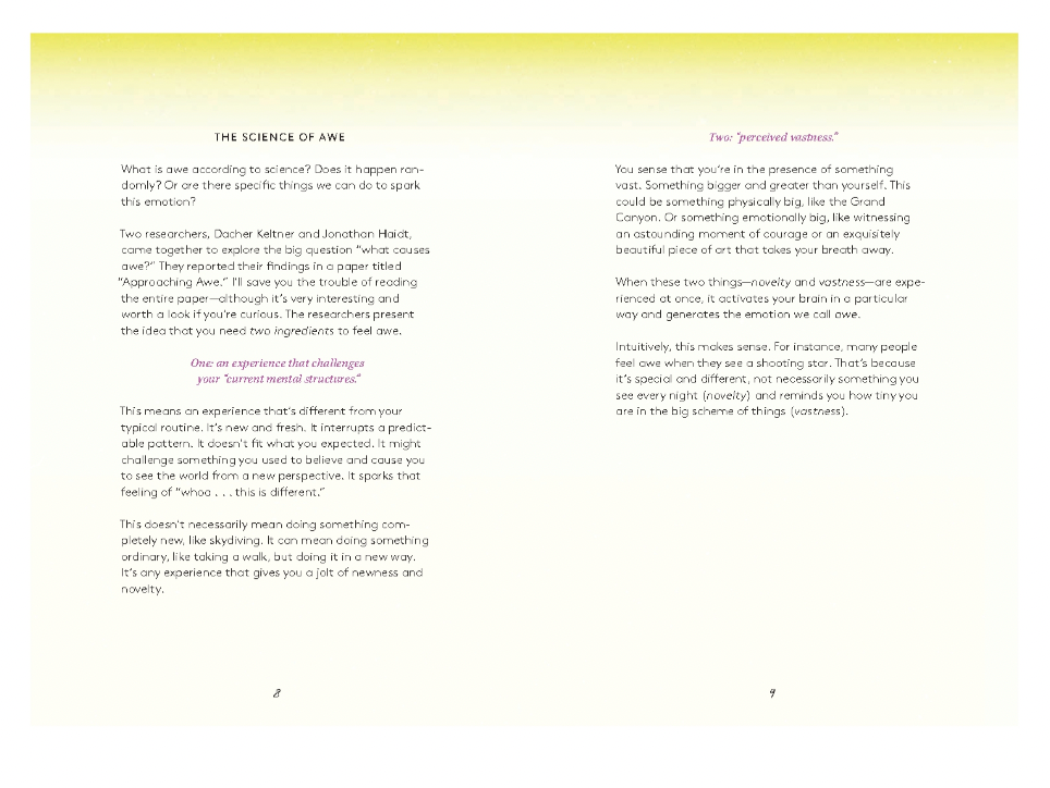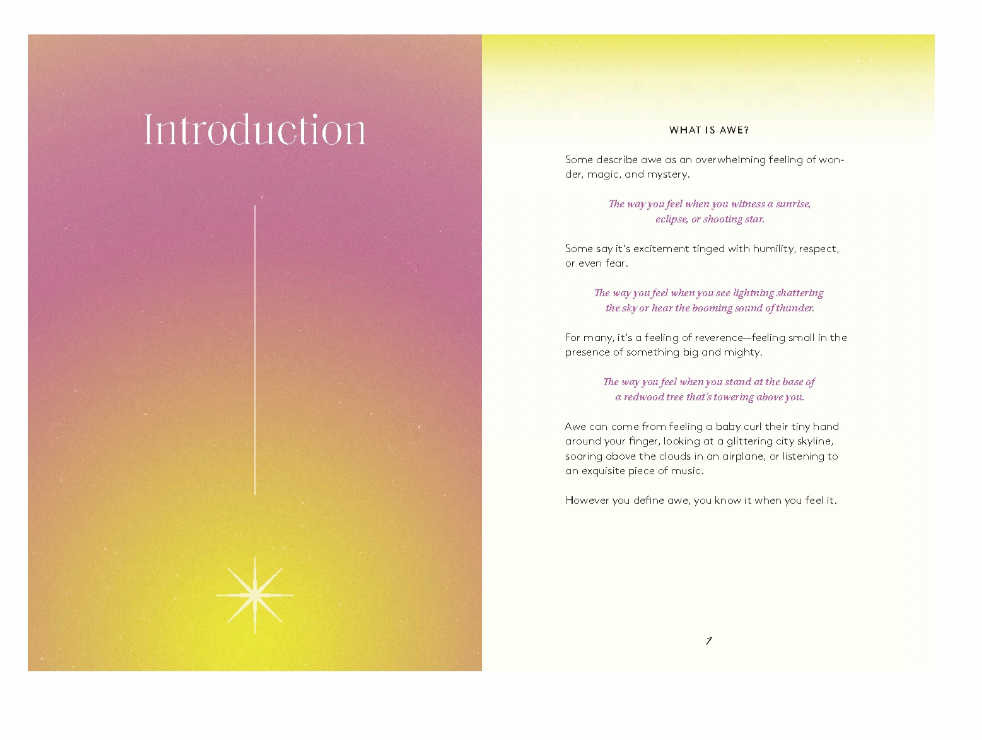 BUILDING ON MINDFULNESS: New research shows that experiencing awe has similar benefits to a mindfulness or gratitude practice. Recent publishing on the topic, including Katherine May's Enchantment and Dacher Keltner's Awe, explores the value of experiencing wonder. This journal adds to the conversation with a light, interactive approach.