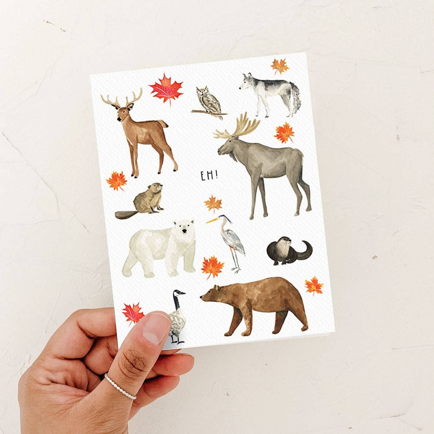 Celebrate the spirit of Canada with this cheerful greeting card featuring adorable Canadian animals and the iconic EH! in the center. Whether it’s a bear, moose, or beaver, each animal brings a charming touch of the Great White North. Printed on high-quality textured cardstock, this card is perfect for birthdays, thank-yous, or simply sharing a bit of Canadian pride.