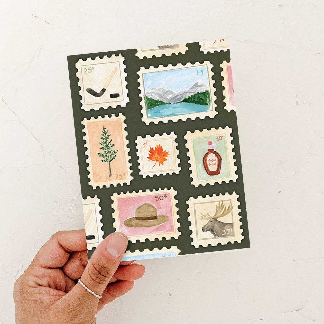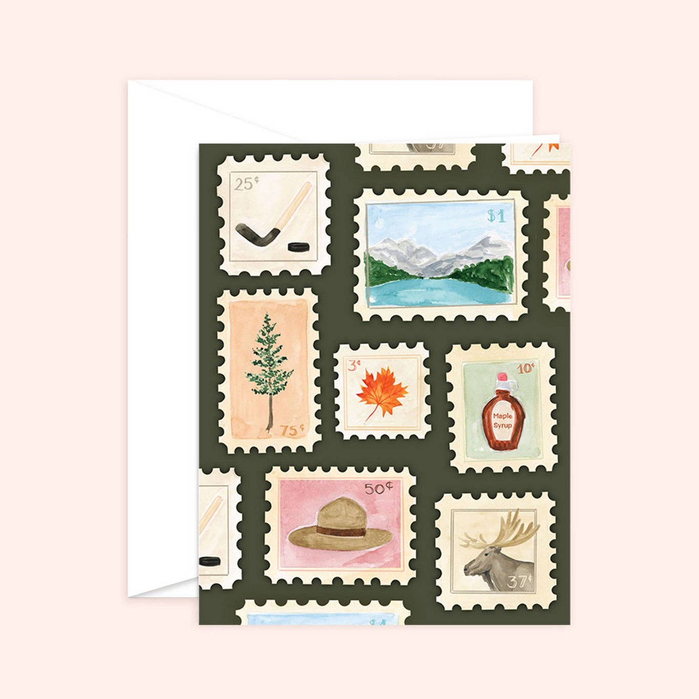 Celebrate the spirit of the Great White North with this beautifully illustrated greeting card featuring a collection of Canadian-inspired postage stamp designs. Each “stamp” highlights an iconic Canadian theme. 4021 GC Essentials • Greeting cards are size A2 (4.25" x 5.5") • Digital print on luxe textured felt paper Choice of White or kraft envelope • Blank inside • Packaged in a clear cello bag