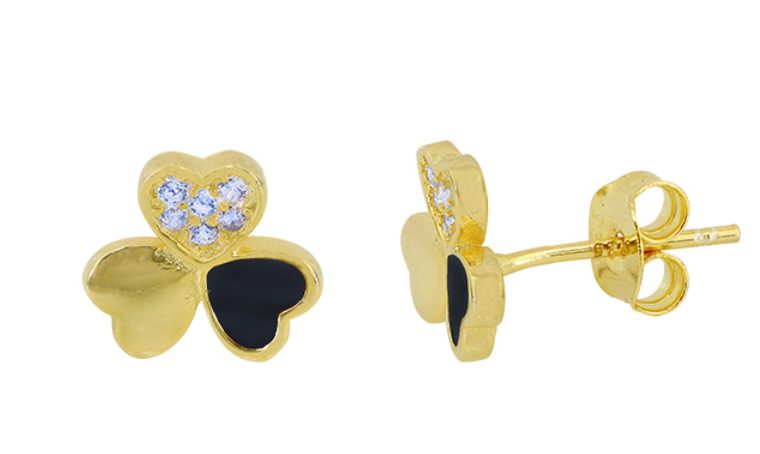 Gold plated on Sterling Silver, three leaf clover shape stud earrings with faceted stones. Approx frame size: 8.5mm D X 1.5mm T.