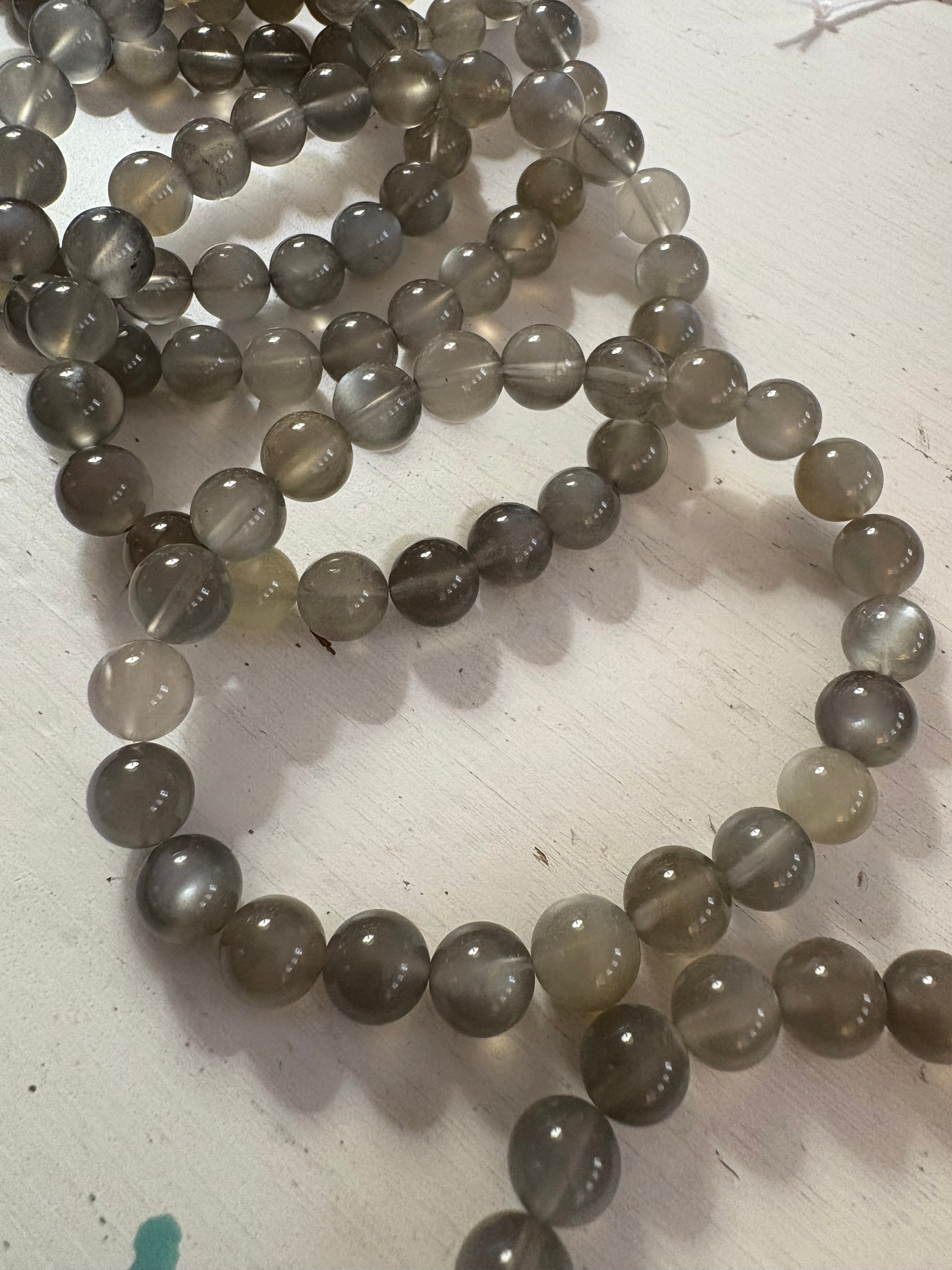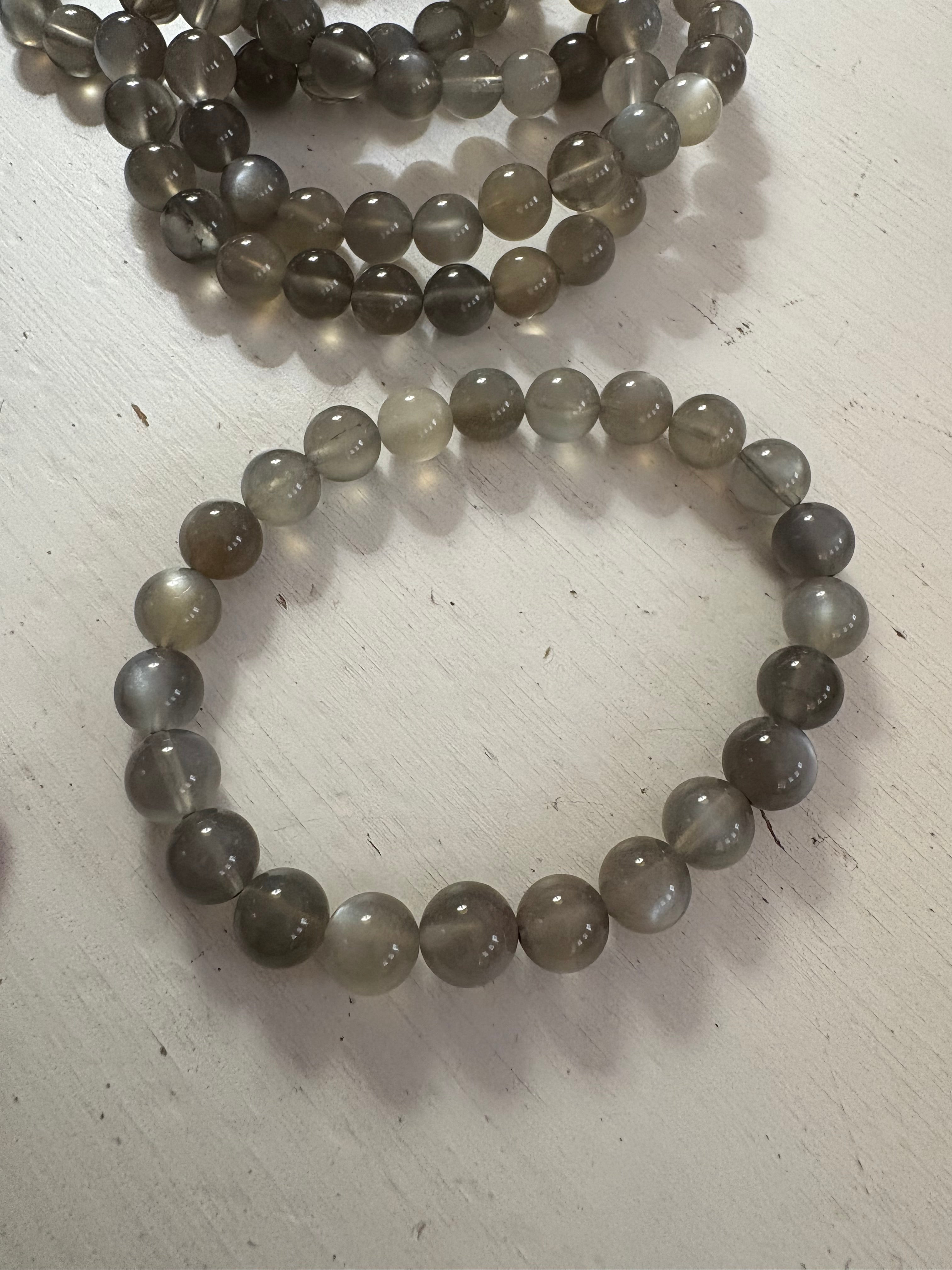 Grey moonstone's spiritual meaning is associated with introspection, intuition, and navigating the unknown, as it's linked to the mysteries of the new moon. It is believed to help with shadow work, emotional integration, and accessing hidden truths, acting as a guide through uncertainty with faith and wisdom. It also carries traditional moonstone meanings of feminine energy, emotional balance, and protection