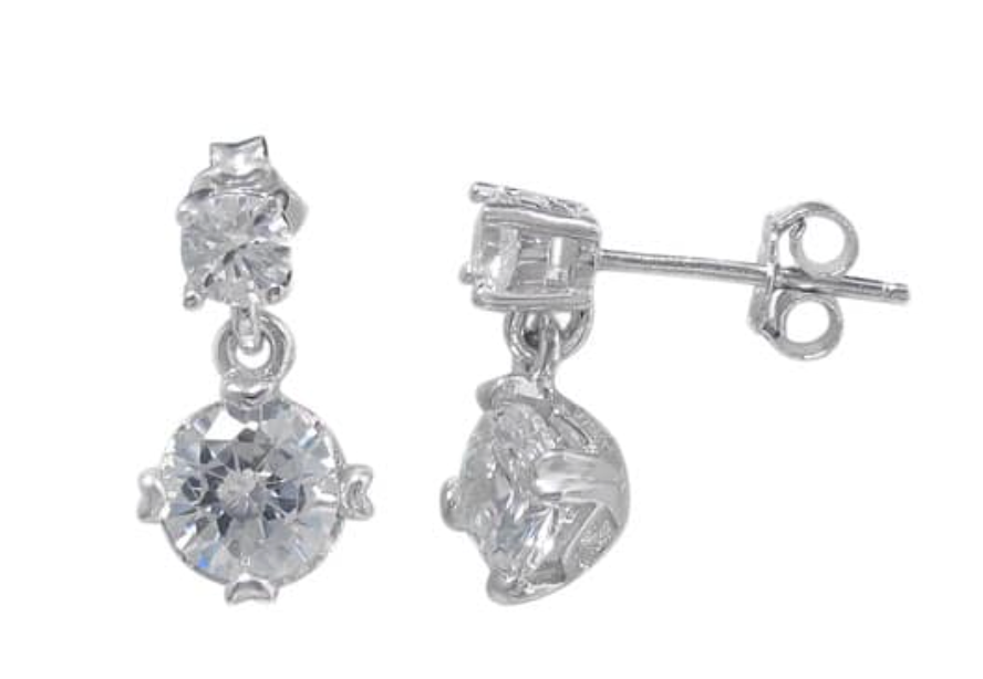 Rhodium plated on Sterling Silver, round shape dangle stud earrings with faceted stone. Approx frame size: 15mm L x 7.5mm W.