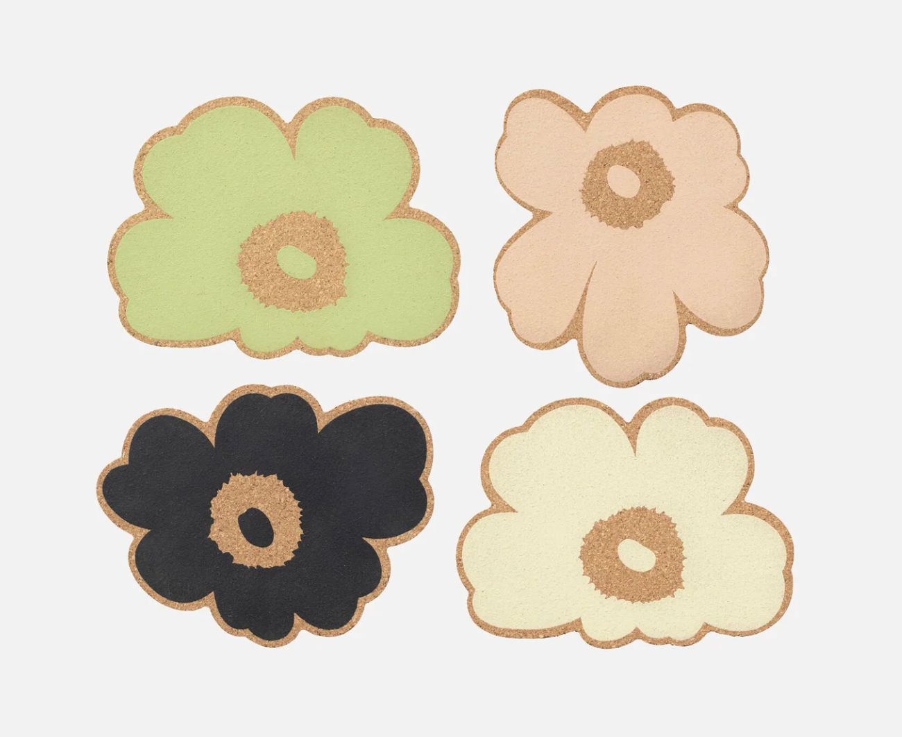 This set includes four Unikko flower shaped coasters. All the coasters feature different colored Unikko flowers printed on one side. We recommend wiping the coasters clean with a damp cloth or washing them by hand. Do not soak.