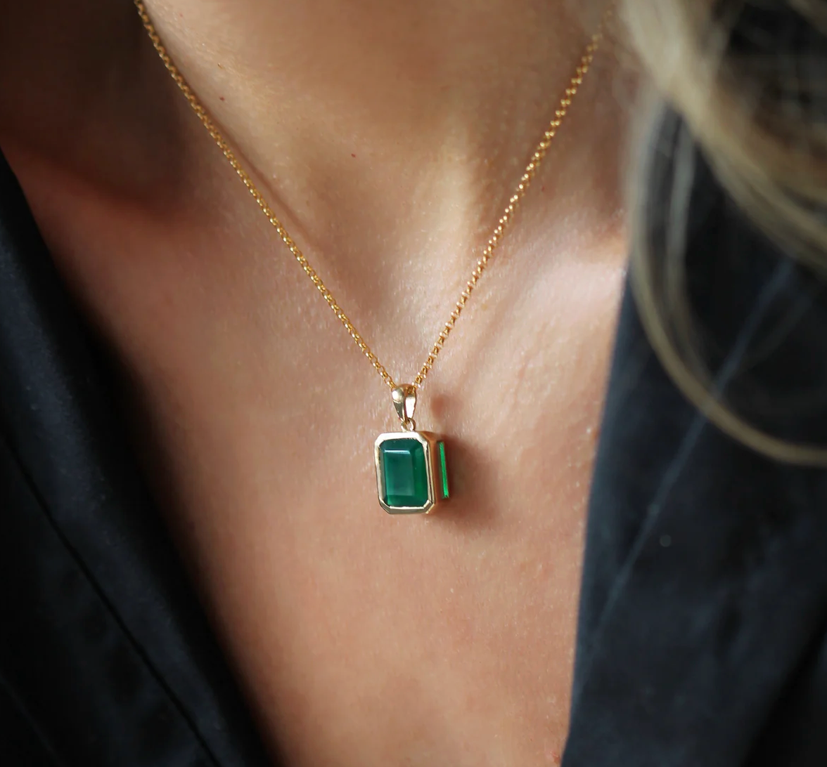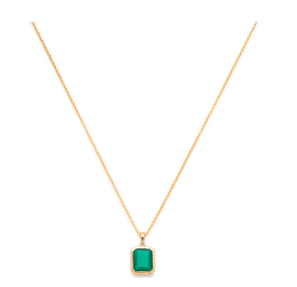 The Angie Necklace features a rectangular Green Onyx pendant in a gold bezel setting on a 14 Karat Gold Filled chain. This emerald-toned necklace is adjustable 16"–18", because statement pieces should still be easy to wear.