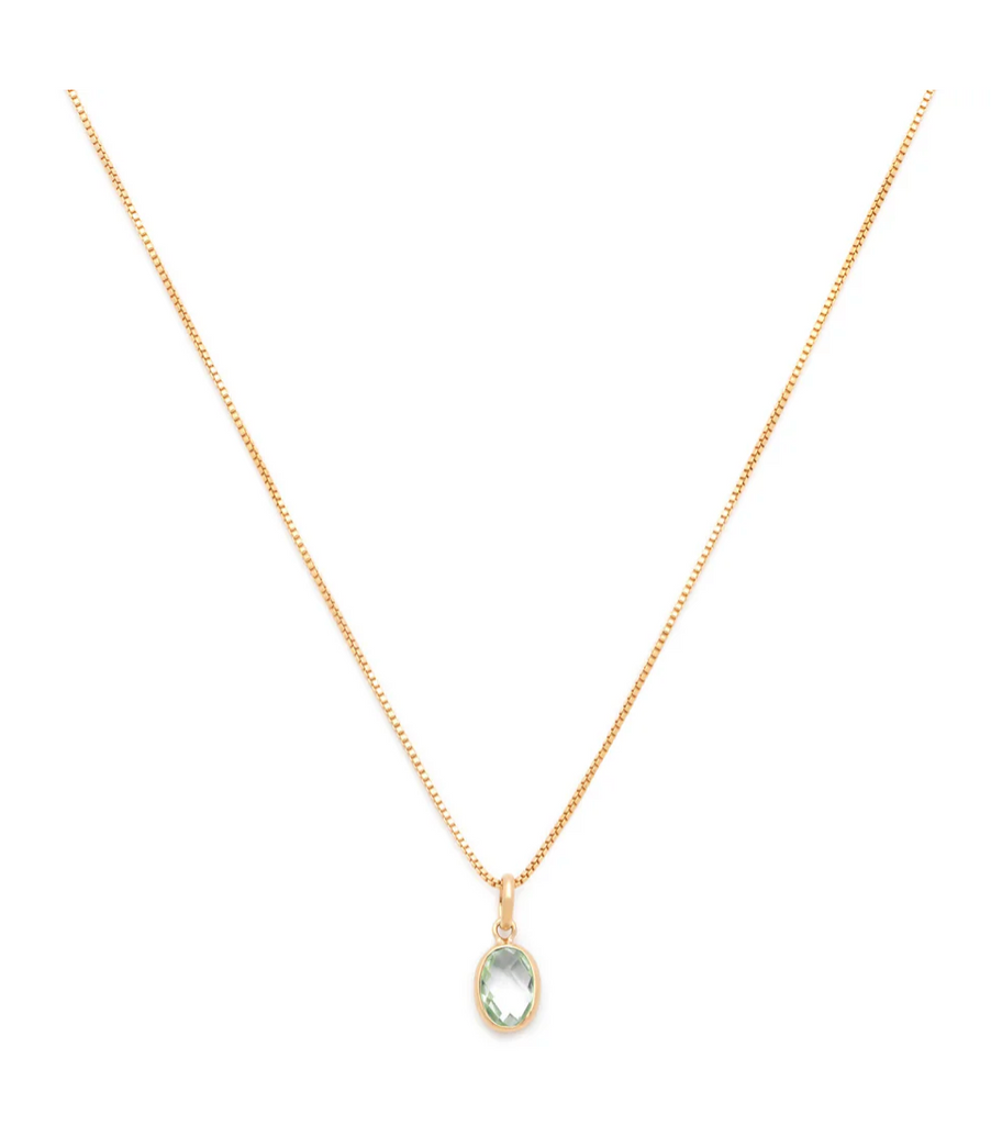 This classic necklace features a stunning Green Amethyst OR White Topaz Oval pendant on a 14 Karat gold filled box chain. With its sophisticated design, the Evelyn necklace adds a touch of luxury to any outfit.