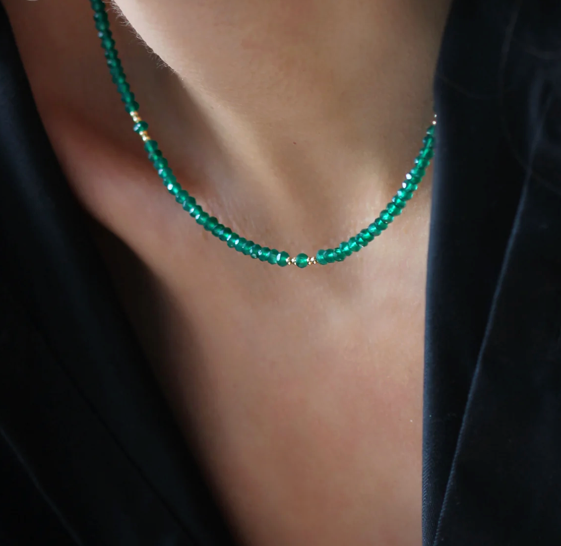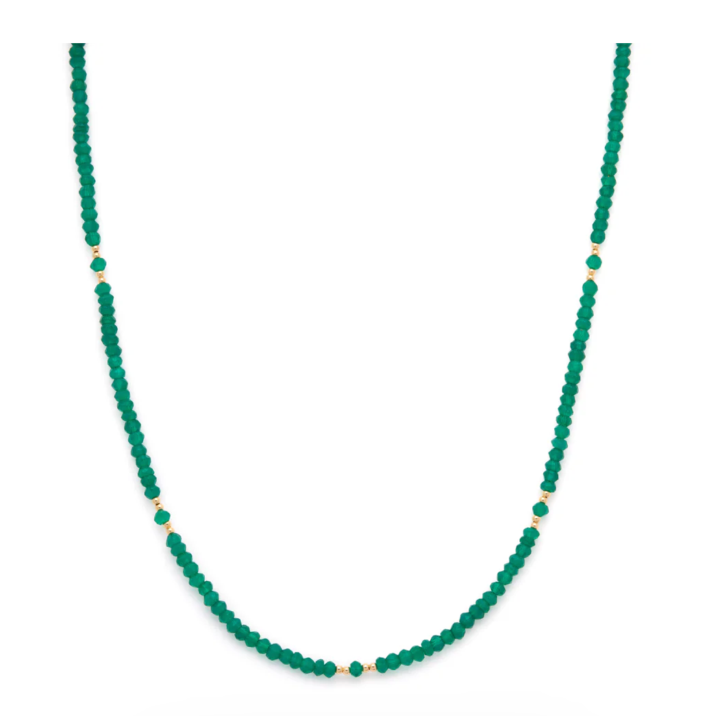 Go green — and gold. The Florance Necklace features green onyx beads spaced with gleaming gold accents, bringing balance and beauty to every neckline. Adjustable 16"–18" length for easy layering.