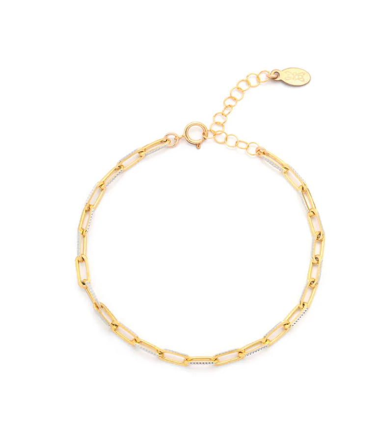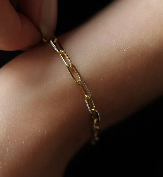 The Harmony Bracelet brings together textured gold and silver links — mixing your metals for you.