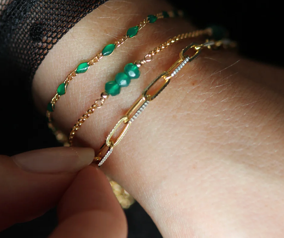 This bracelet is made with 14 Karat Gold plated Sterling Silver chain links with a gold-filled clasp and extender. Adjustable 6.75"–8", it’s your perfect everyday bracelet with a twist.