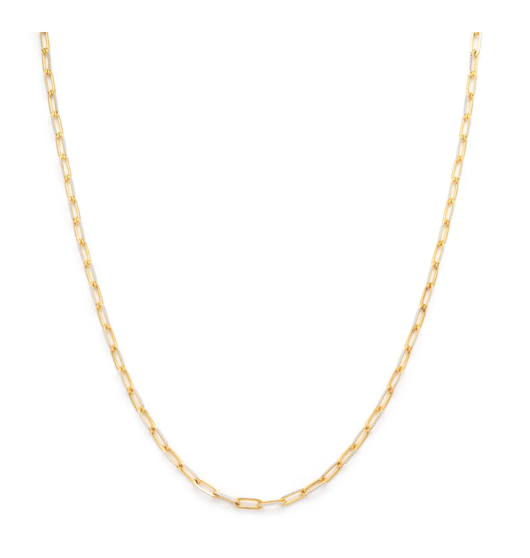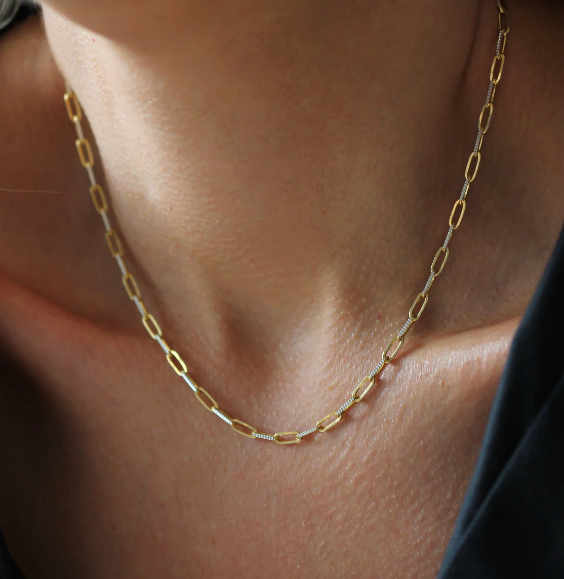 Your new go-to for effortless layering. The Harmony Necklace combines gold and silver textured links for a look that plays well with every piece you own.
