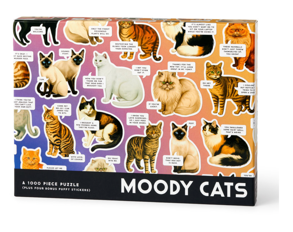 1000 PIECE PUZZLE - Dive into the world of Moody Cats with this 1,000-piece puzzle, where each cat has a distinct, often dramatic personality. From irritated looks to downright sass, these feline friends are here to express their opinions on life (and they're not holding back). This spot UV puzzle brings to life a variety of cats with humorous, exaggerated expressions that will have you laughing as you piece together their delightful personalities.