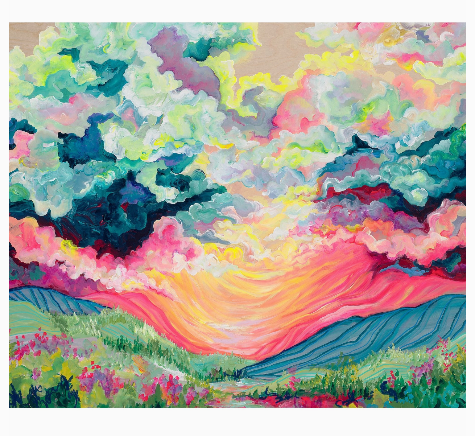 Experience the magic of daybreak with this stunning abstract landscape puzzle, featuring bold sunrise over a valley of fields and flowers.