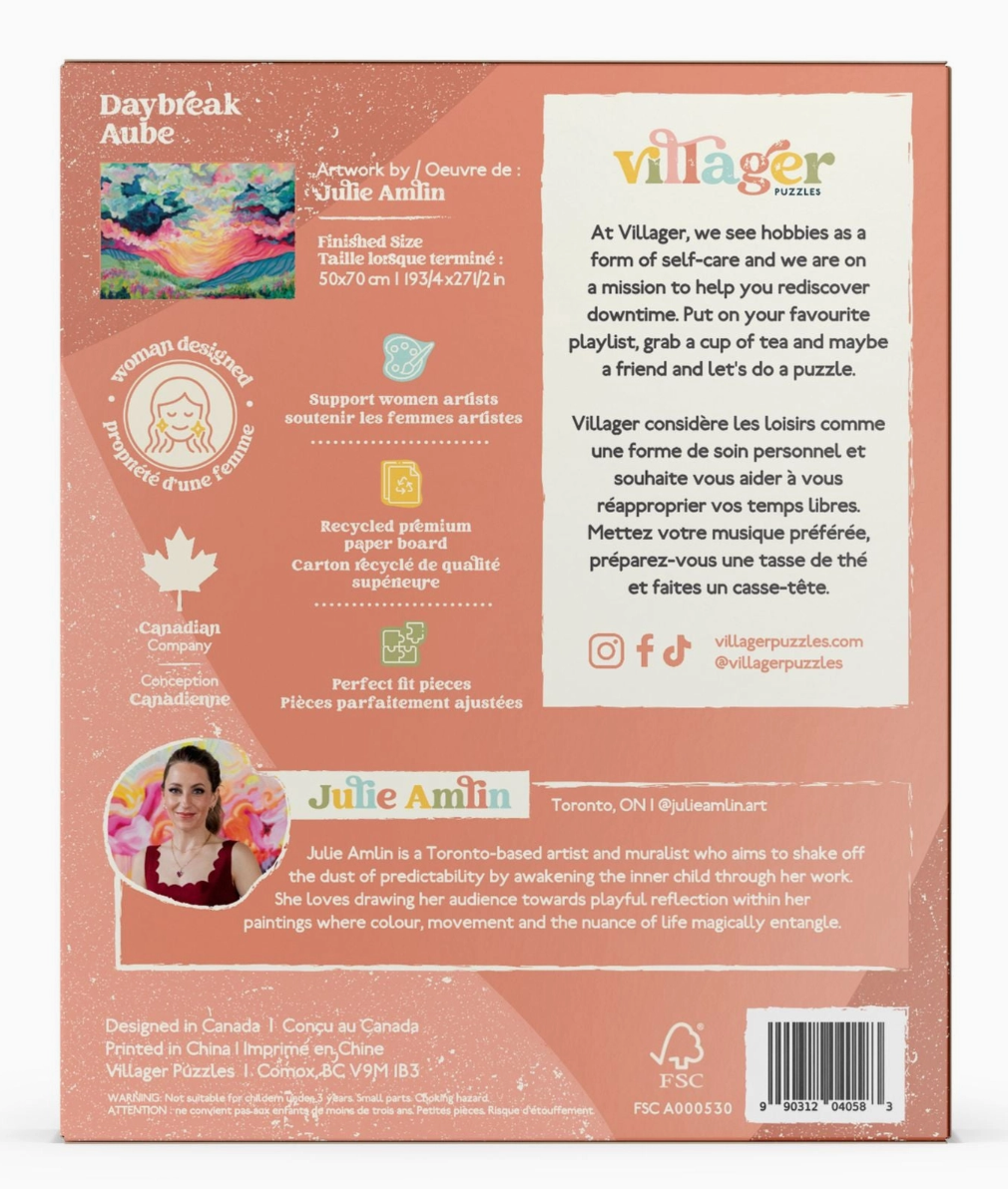 Designed by Toronto artist Julie Amlin, this vibrant scene allows you to enjoy this dreamy time of day all from the comforts of home. Pairs with colourful decor and gifts. Style is vibrant and abstract. Great gift idea or souvenir for visitors to Ontario. * 1000 perfect-fit pieces * Matte, textured finish for less glare * Recycled premium blue paperboard * Magnetic closure box with poster * Finished size: 50x70 cm | 19.75x27.5"