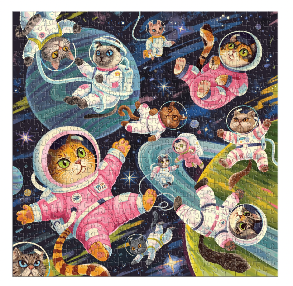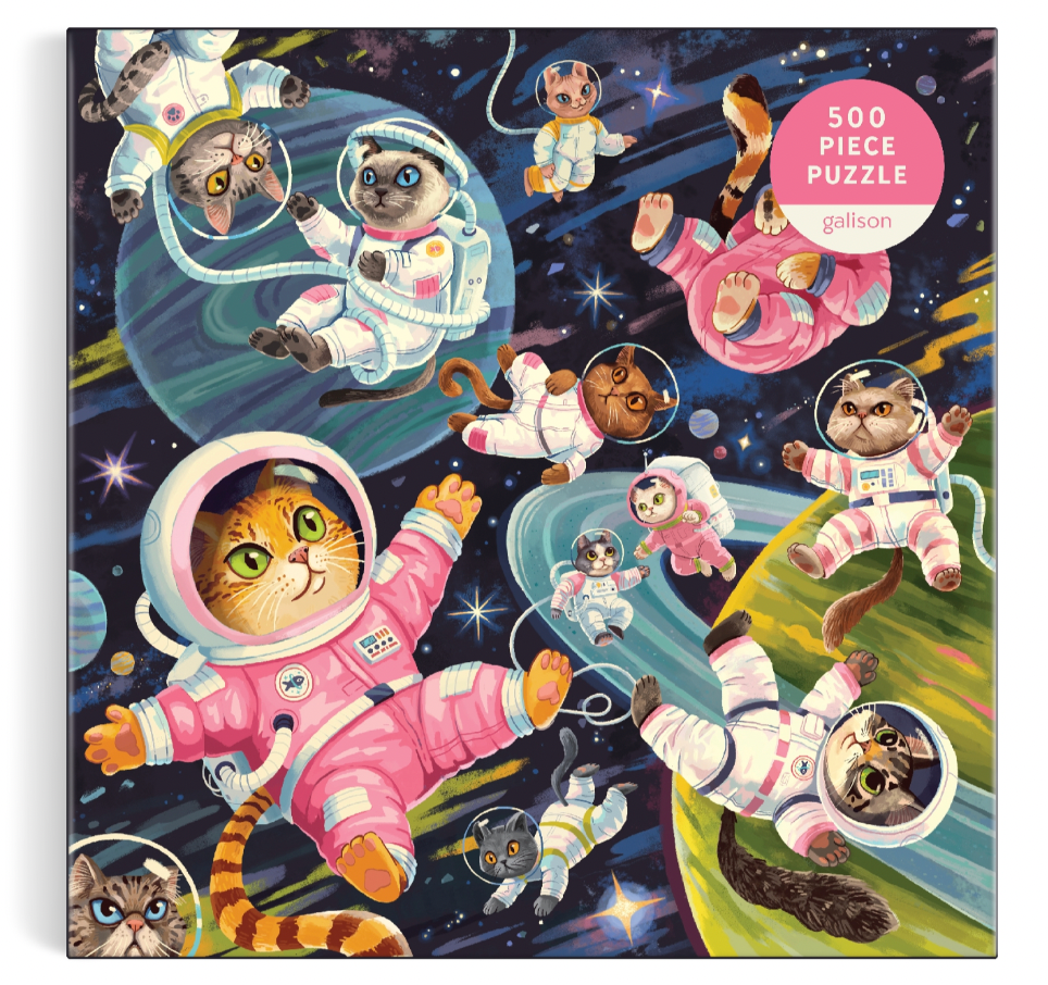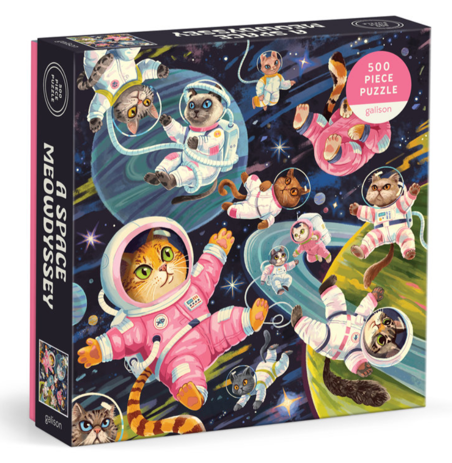 500 PIECE PUZZLE - Suit up for an interstellar adventure with the A Space Meowdyssey 500 Piece Puzzle by Galison. This colorful, imaginative puzzle features cats as daring astronauts exploring the cosmos. Piece by piece, you'll uncover a playful galaxy filled with floating feline explorers, starry skies, planets, and whimsical space gear. It's the perfect journey for cat lovers and dreamers alike - no spaceship required.