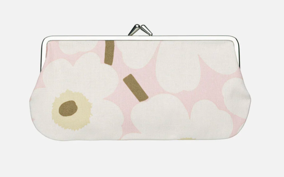 The Silmälasikukkaro purse is made of cotton in the Mini Unikko pattern, which is printed in Helsinki. The rectangular purse has a metallic frame that is easy to snap open and shut.