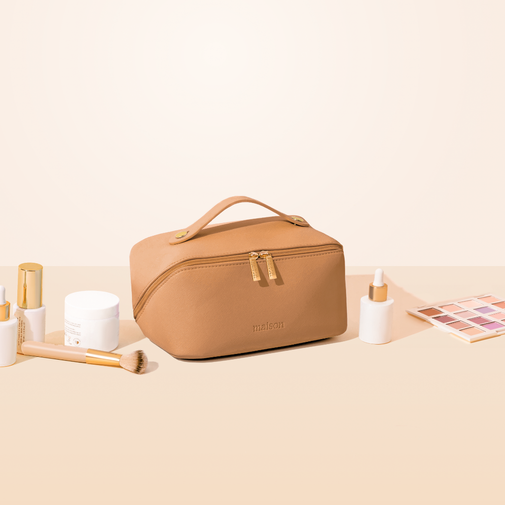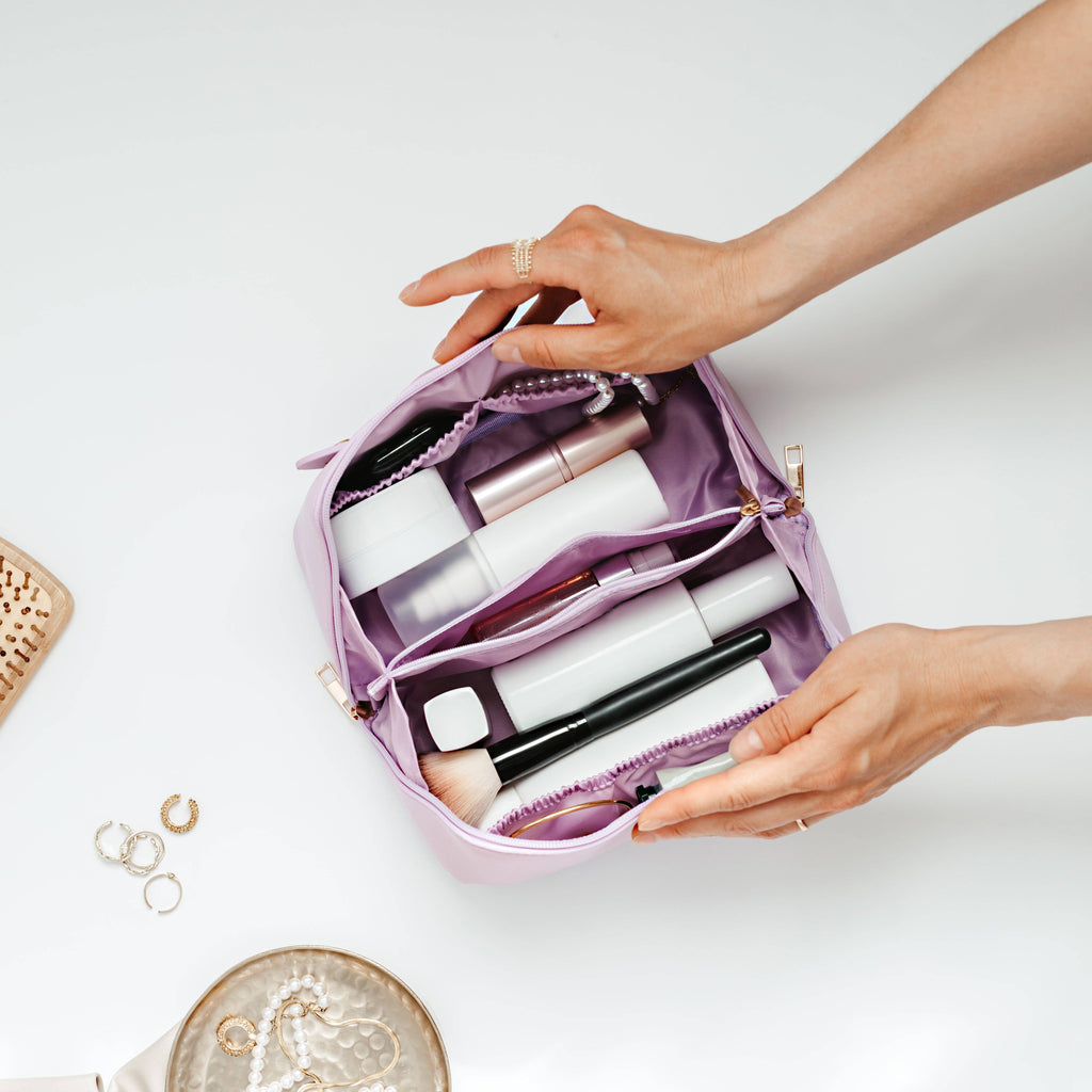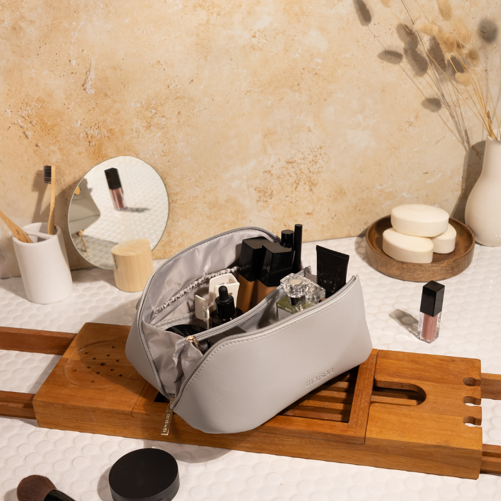Meet SALY, the revolutionary make up bag - it's the perfect solution for your on-the-go beauty needs! Our unique, expandable design allows you to easily store all of your full-sized skincare products, cosmetics, and jewelry in one convenient location. The bag is made with high-quality materials and is designed to be travel-friendly, making it the ultimate accessory for any jet-setter. With our stylish and functional makeup bag, you'll never have to worry about disorganized beauty essentials again!