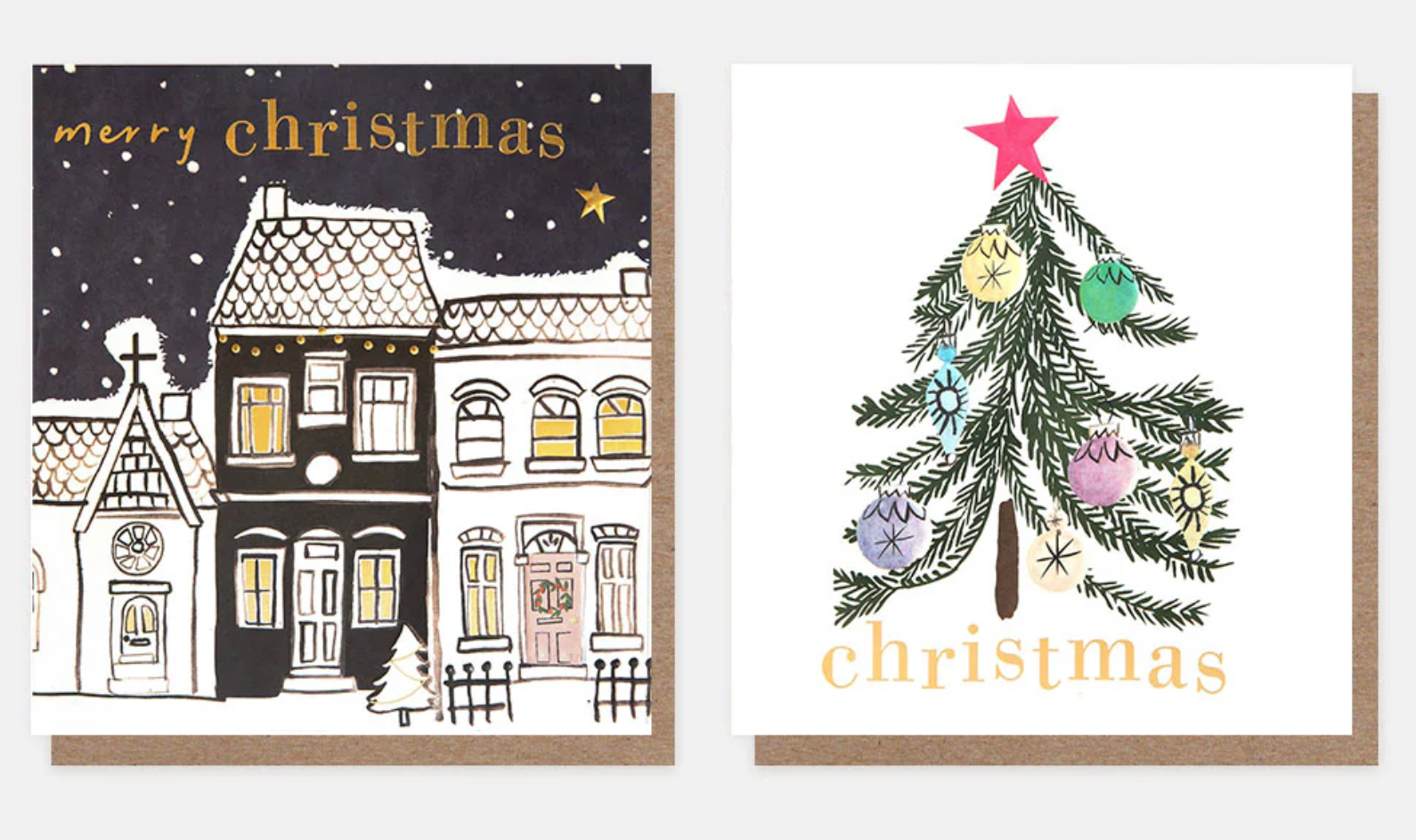 These Christmas Card pack contains 8 cards each with the message 'merry christmas and a happy new year' inside. Choose from cute snowy street scene and tree with baubles & star designs, with 4 of each contained in the box. 25p from each pack sold is donated to Meningitis Now.